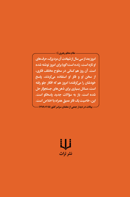اميدوارم اين اثر بتواند بيش از پيش جامعالاطراف بودن اين شهيد والامقام را نشان دهد كه به فرموده رهبر معظم انقلاب (حفظه الله): «امروز بعد از سی سال از شهادت آن مرد بزرگ، حرفهای او تازه است، زنده است؛ گویا برای امروز نوشته شده است. آن روز هم کسانی در سطوح مختلف فکری، از سخن او و فکر او استفاده میکردند، پاسخ خودشان را میگرفتند؛ امروز هم که افکار جلو رفته است، مسائل بسیاری برای ذهنهای جستجوگر حل شده است، باز به سؤالات جدید پاسخگو است. این، خاصیت یک فکر عمیقِ همراه با اخلاص است».